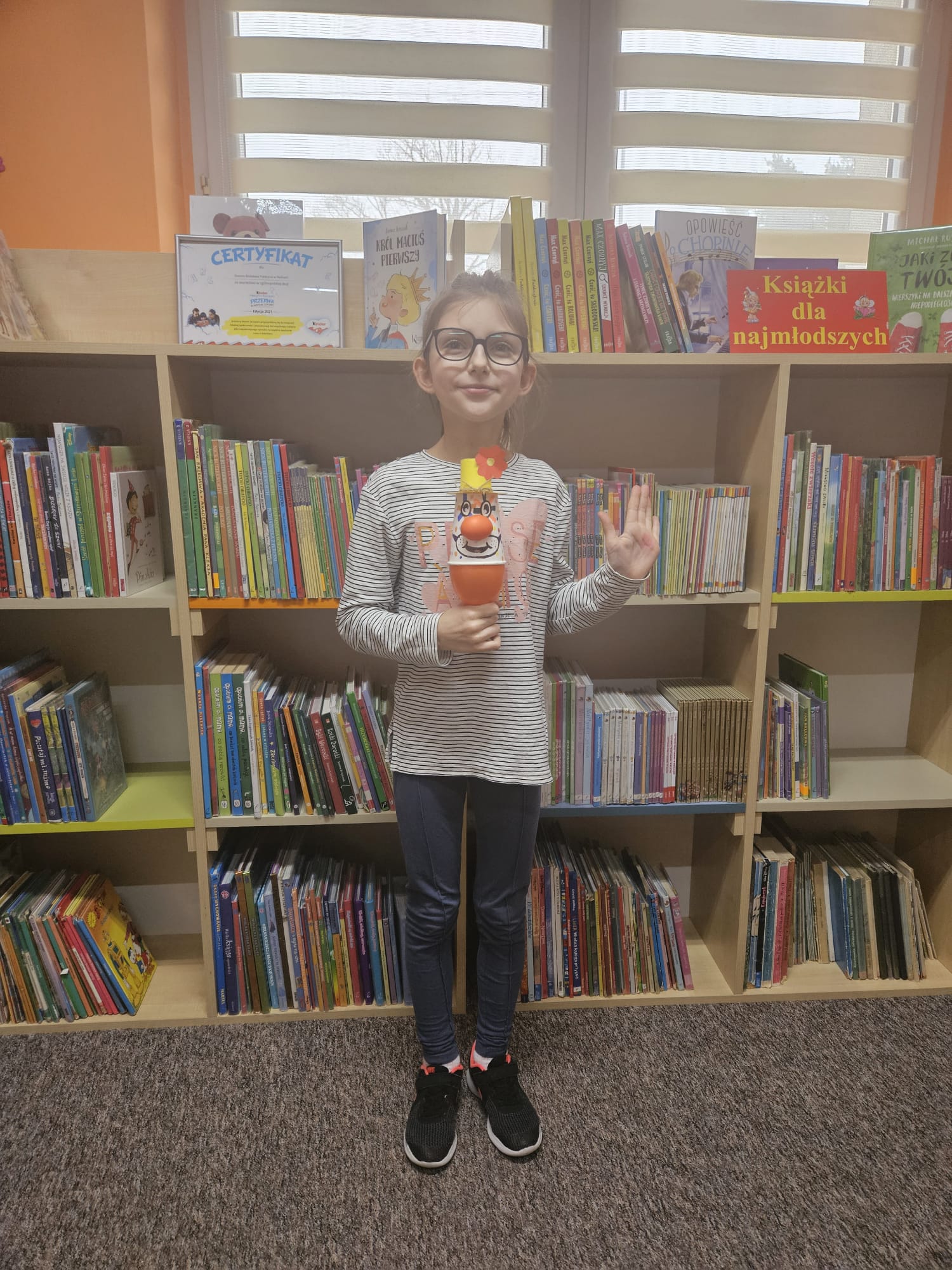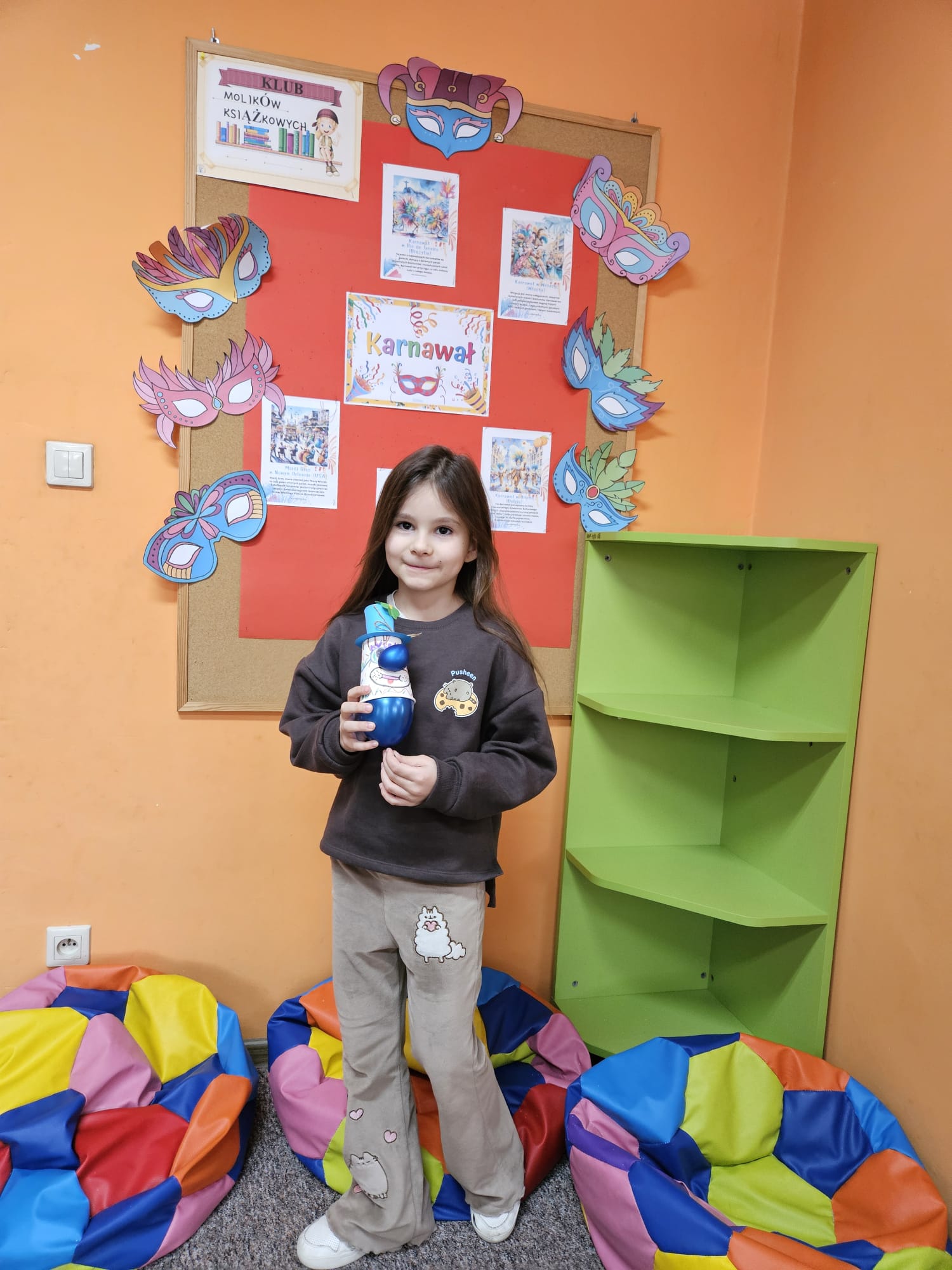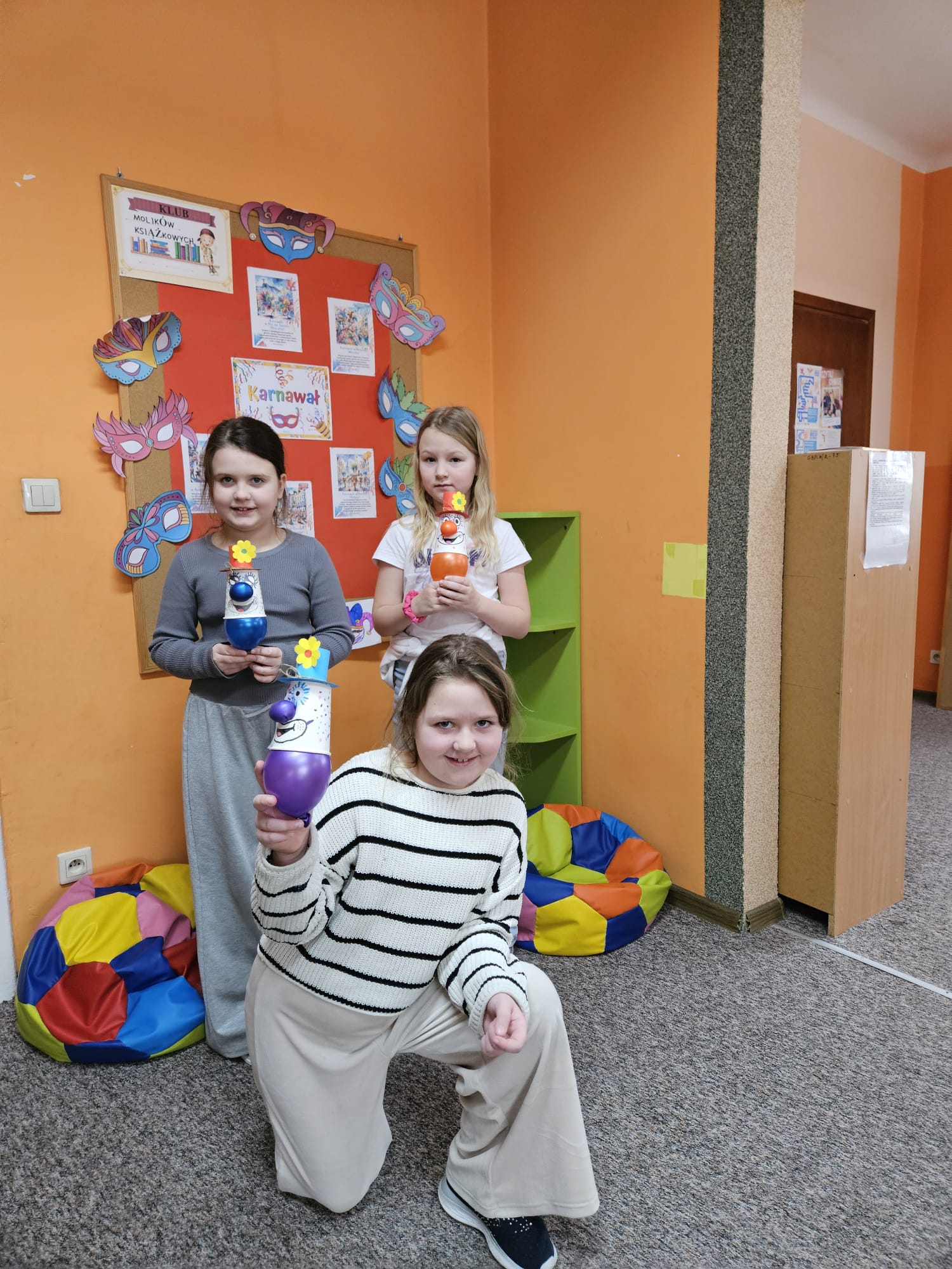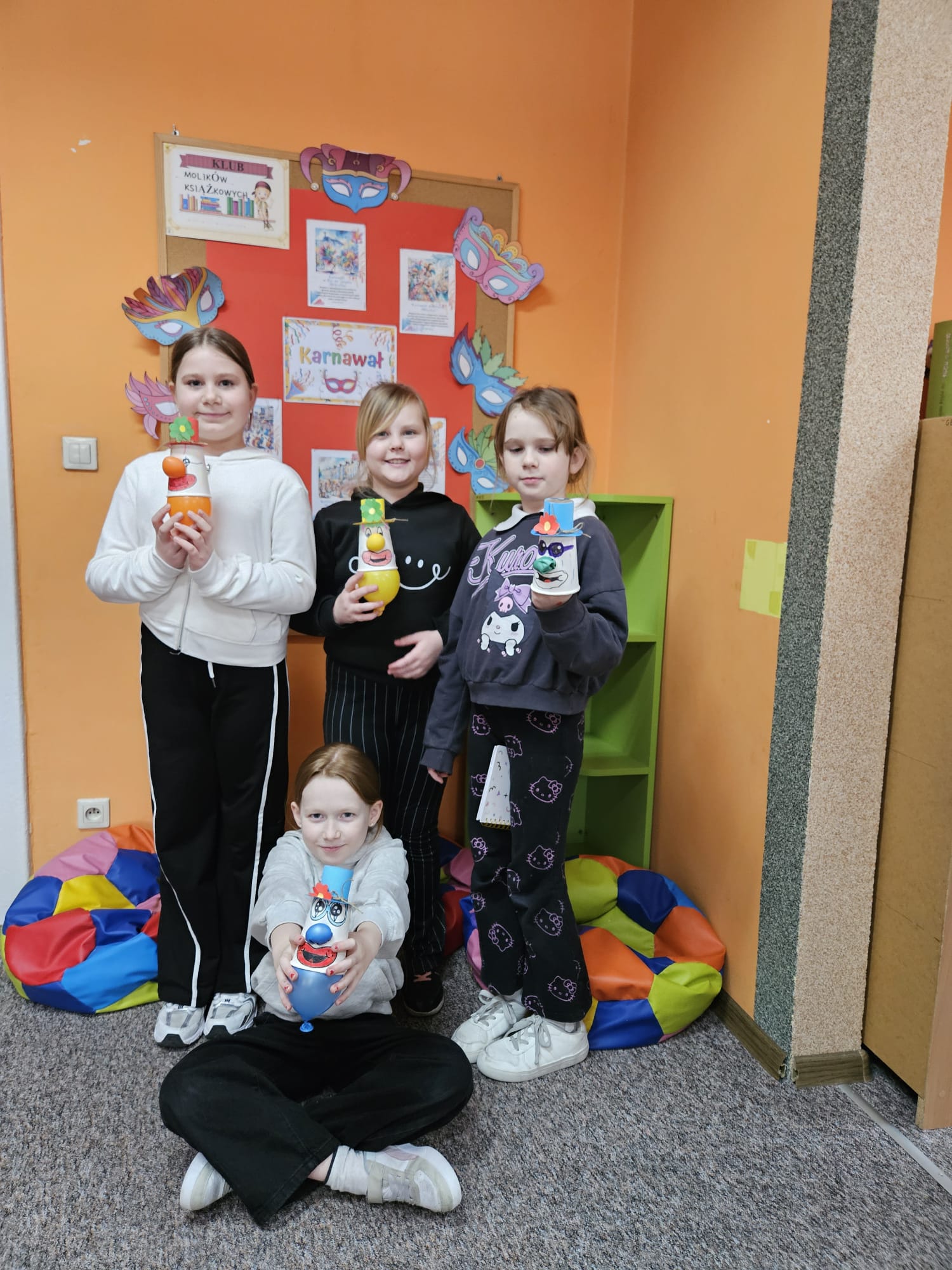 Za nami kolejne spotkanie z Molikami Książkowymi. Tematem przewodnim zajęć był karnawał. Nasi najmłodsi czytelnicy nie tylko dowiedzieli się skąd pochodzi karnawał i co oznacza to słowo, ale również jak był obchodzony w dawnej Polsce i jak wygląda to dzisiaj zarówno w naszym kraju, jak i na całym świecie. A z czym kojarzy się karnawał? Oczywiście z dobrą zabawą i radością. Dla budowania takiej atmosfery podczas karnawałowych zabaw kluczową postacią jest klaun. I właśnie takiego klauna zrobili nasi milusińscy podczas zajęć. Wystarczył papierowy kubek, balon oraz kolorowy papier, aby powstał śmieszny klaun z nadmuchiwanym noskiem😊