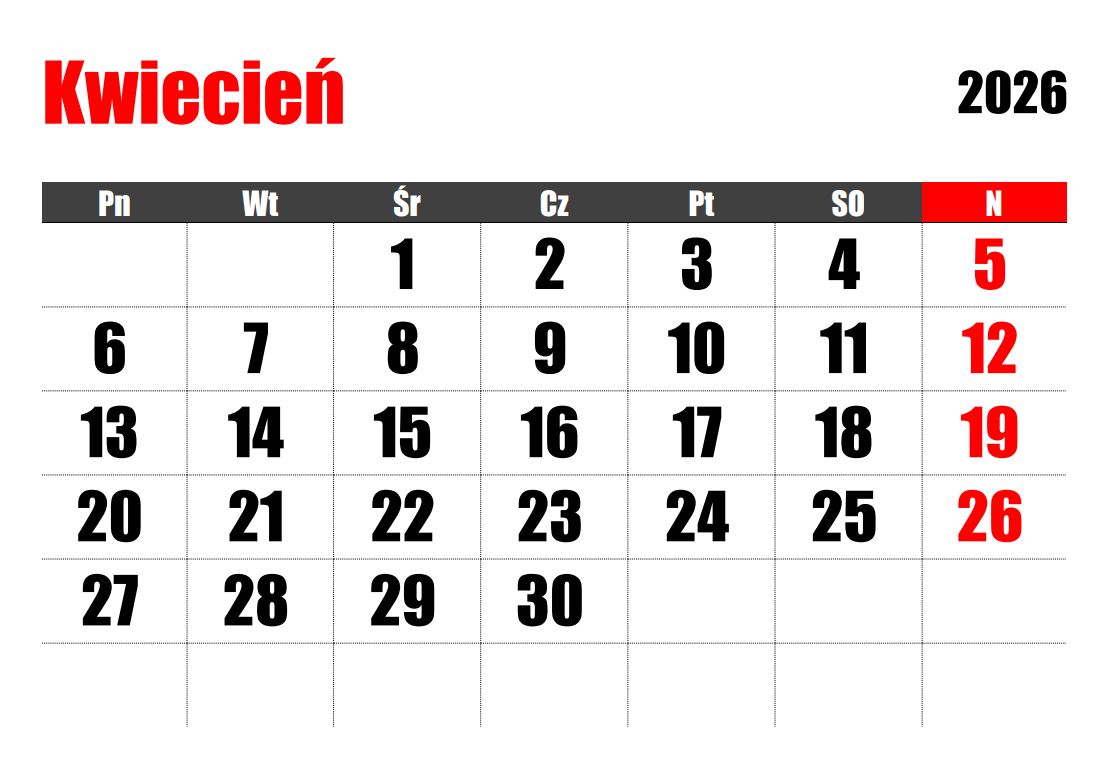 Kalendarz kwiecień 2024 (źródło: kalendarz.su)